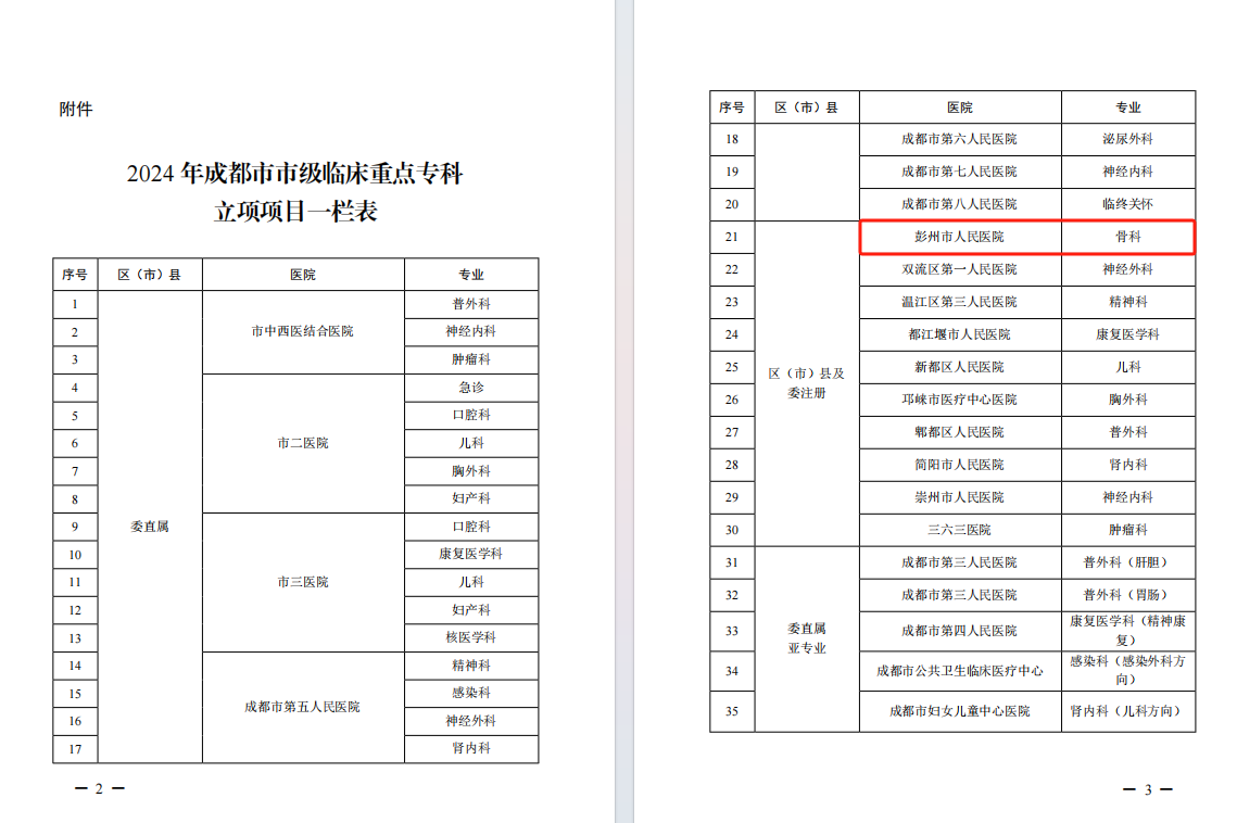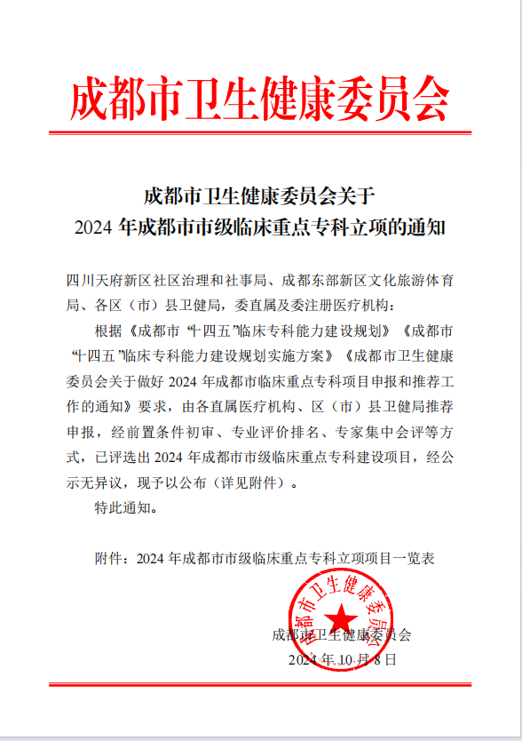 近日,我院成都市市级临床重点专科建设项目再添新成员。继眼科、心血管内科后骨科经前置条件审核、监测数据评估、专家评审三个程序,于2024年被成都市卫健委评选为“成都市市级临床重点专科建设单位”。
