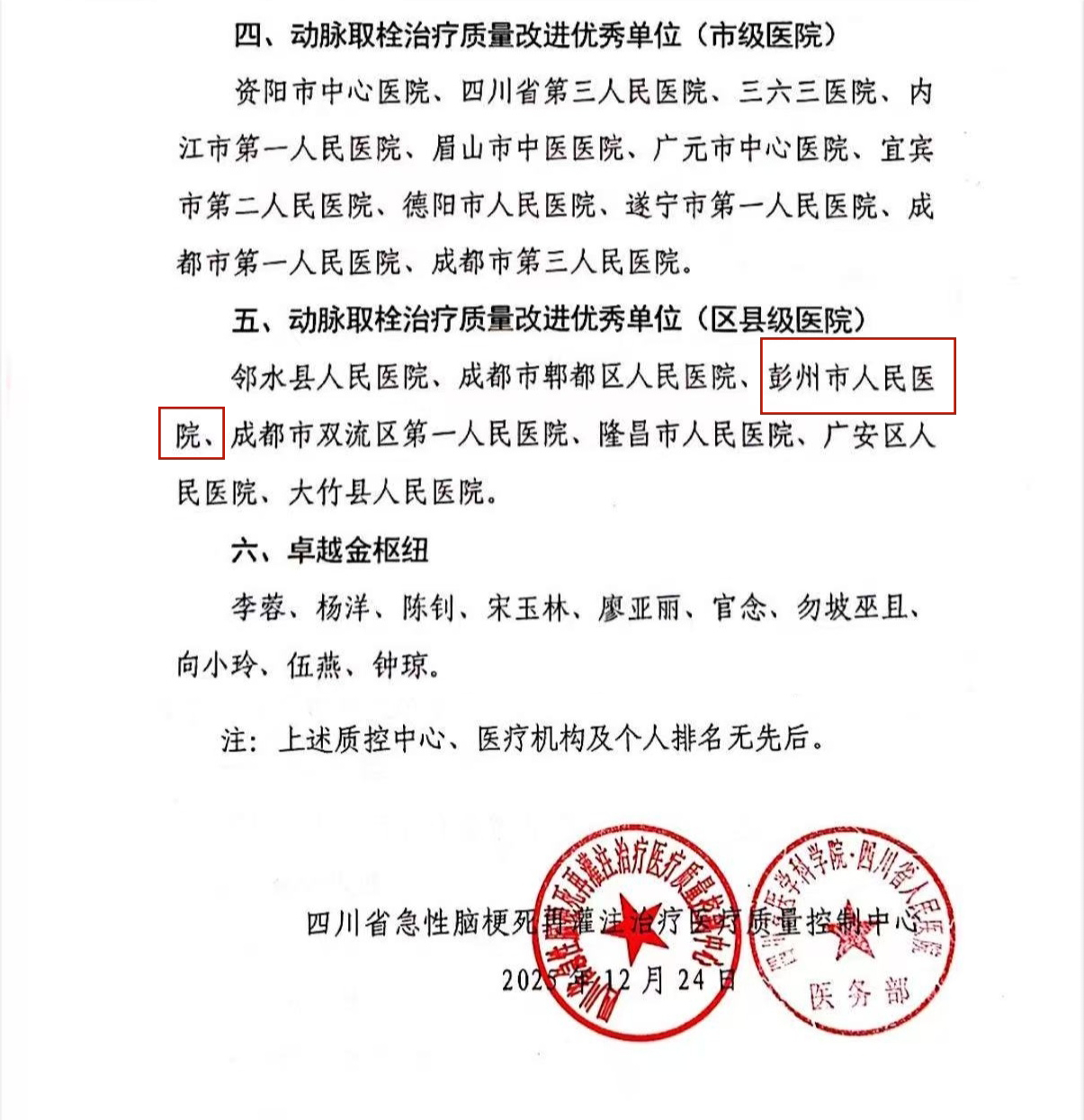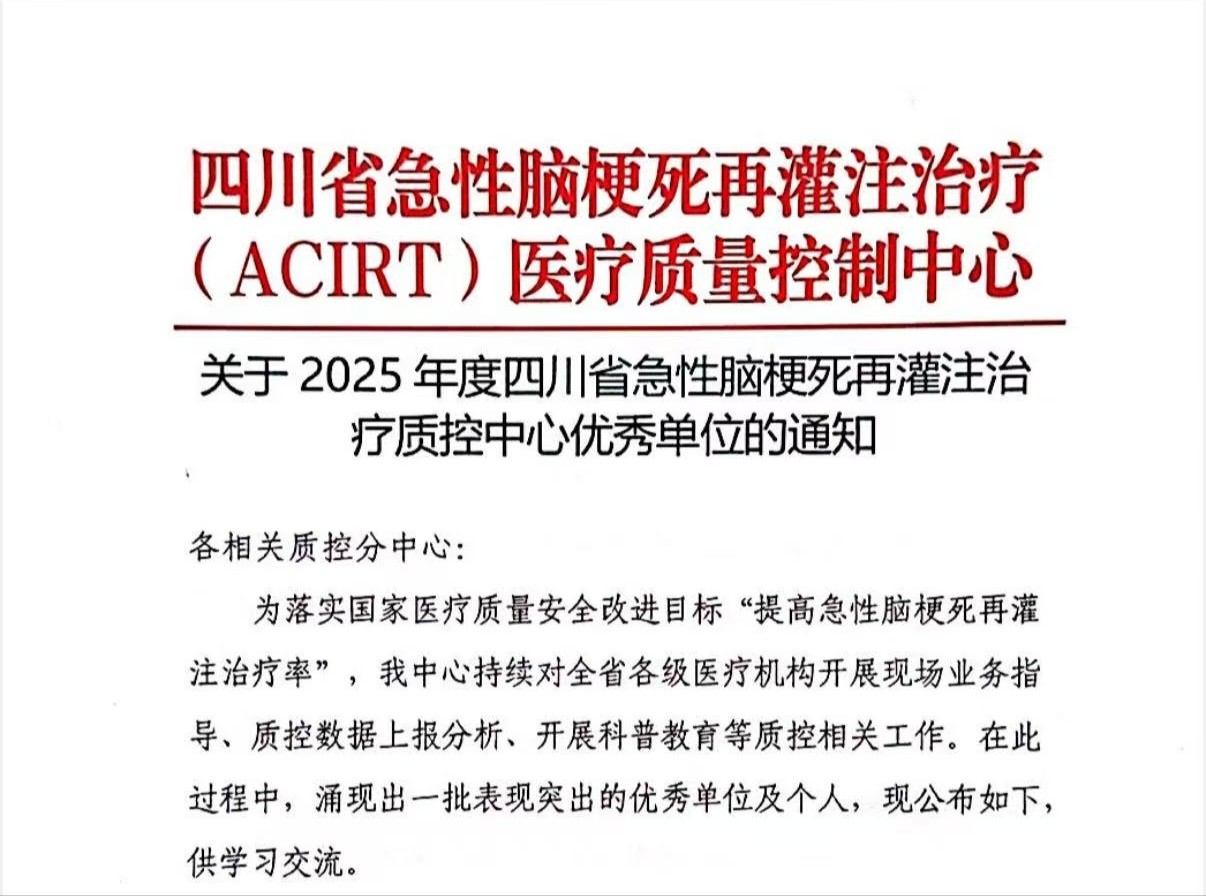 近日,在四川省急性脑梗死再灌注治疗(ACIRT)医疗质量控制中心2025年年度工作总结会议上,彭州市人民医院神经内科凭借在急性脑卒中动脉取栓治疗中卓越的技术实力和出色的质量管理,被四川省急性脑梗死再灌注治疗医疗质量控制中心授予“四川省区县动脉取栓治疗质量改进优秀单位”称号。