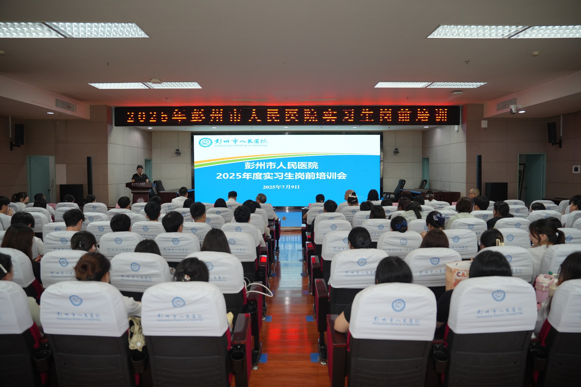 2025年7月9日,彭州市人民医院举办“2025年度实习生岗前培训会”,院领导班子、科教培训部、医务部、护理部等8个职能部门代表出席了会议,西南医科大学、川北医学院、成都医学院等200余名同学参加了培训。