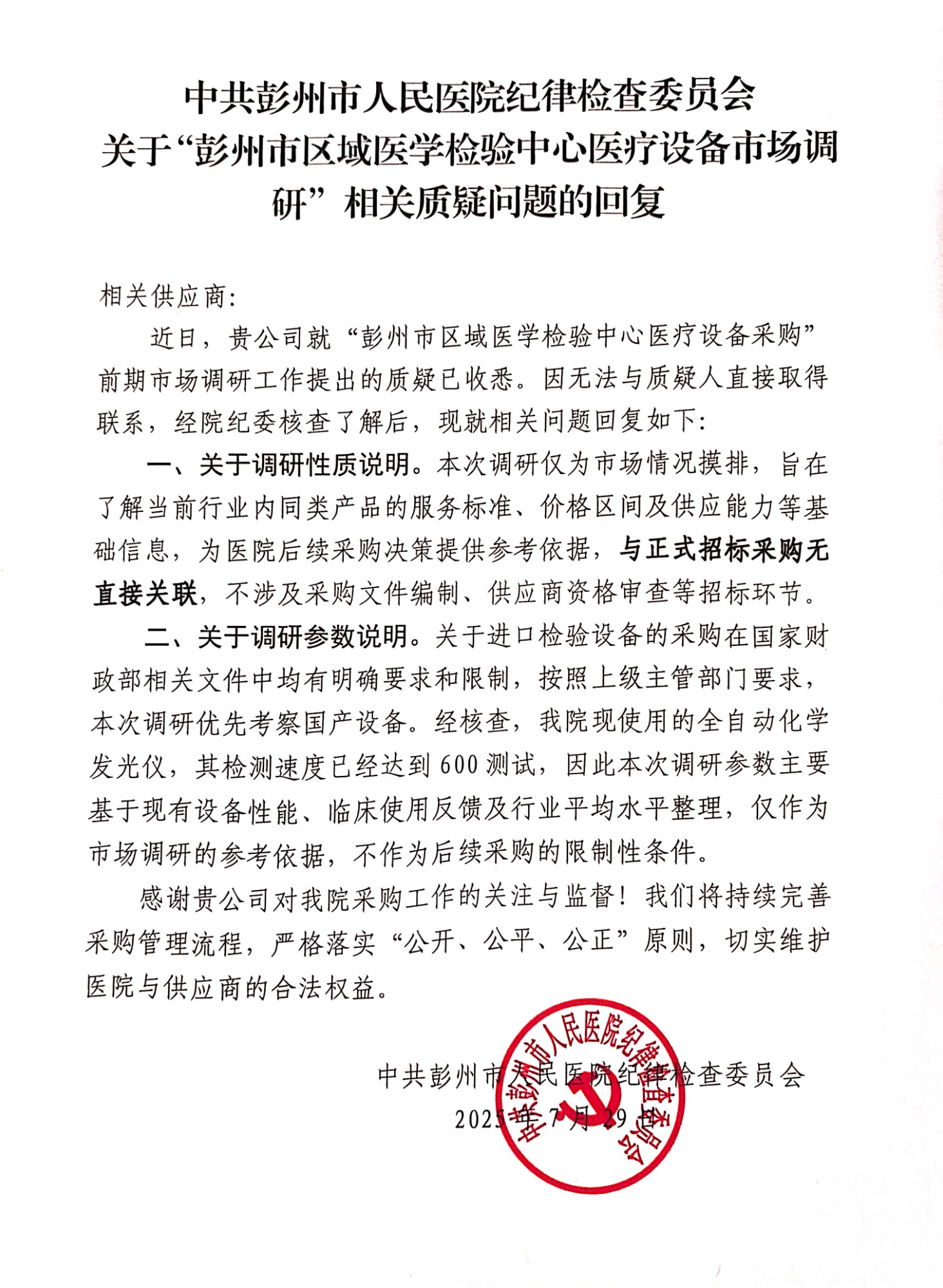 中共彭州市人民医院纪律检查委员会关于“彭州市区域医学检验中心医疗设备市场调研”相关质疑问题的回复-通知公告-新闻动态-彭州市人民医院