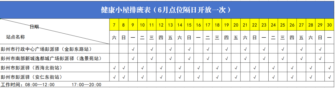 周一至周日上午08:00-12:00,下午 17:00-20:00(四个彭派驿站点轮流服务)