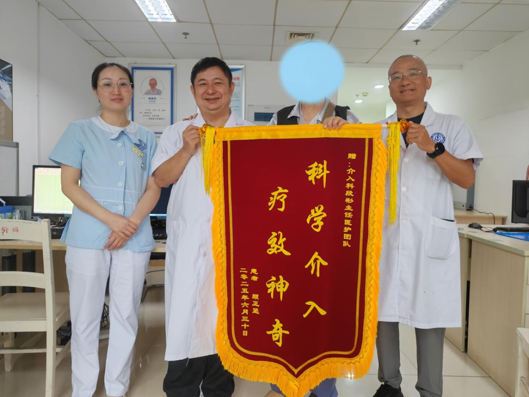 近日,彭州市人民医院介入科医生办公室内暖意融融。74岁的颜先生(化名)在家属的陪同下,亲手将一面书写着“科学介入,疗效神奇” 的鲜红锦旗,郑重地交到段彬主任及赖景奎主任团队手中。颜先生声音哽咽:“是你们给了我第二次生命,感谢你们精湛的医术和无微不至的关怀!”