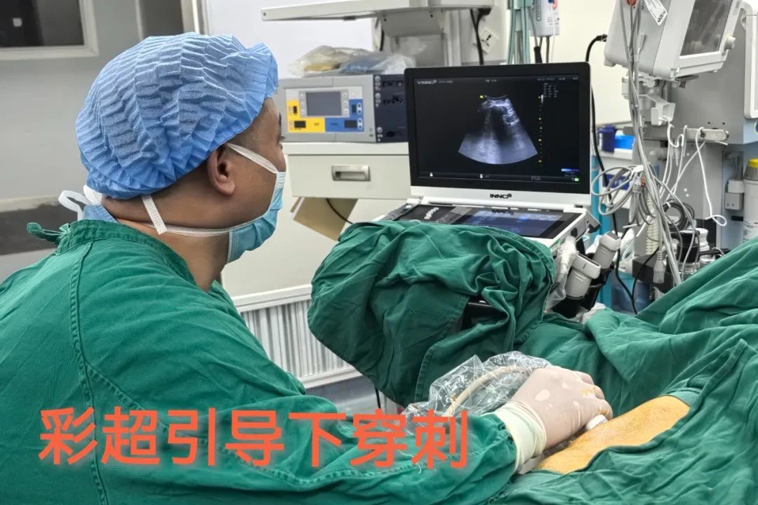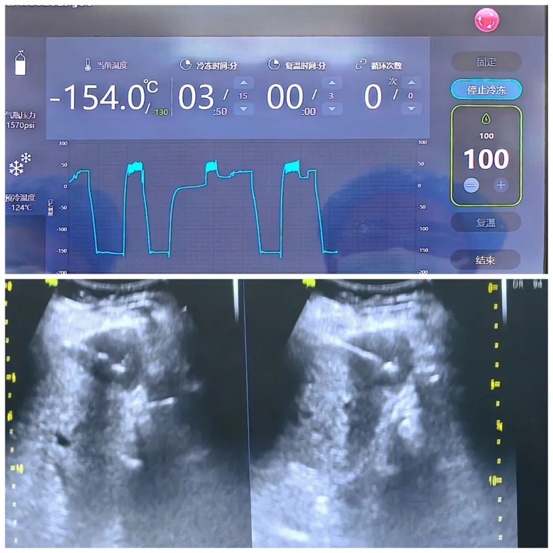 一个月后,患者再次入院,CT检查病灶内碘化油沉积充分,体积缩小,AFP降至正常水平。微创介入中心专家团队按计划为颜先生行超低温冷冻消融治疗,由于病灶位于S6段,紧贴肝包膜,邻近结肠肝曲和右肾上极,超低温冷冻消融治疗可以最大程度保全邻近组织解剖结构,介入科龚明医生在全麻下超声引导精准穿刺病灶中心,开启冷冻至零下154℃,使冰球包裹病灶,经3次冷冻-复温循环,用时1小时结束手术,患者至ICU观察24小时后安返病房,四天后顺利出院。